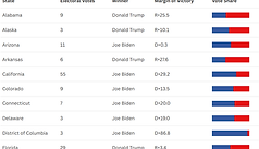 View state-by-state U.S. presidential election results from 2008 to the present, highlighting each party's margin of victory and average vote share. Analyze how Democratic and Republican support has shifted across states in recent elections with clear, comparative data.